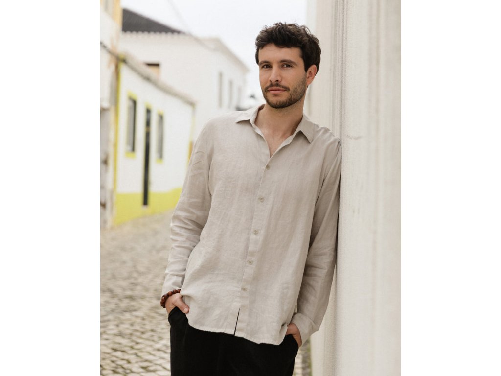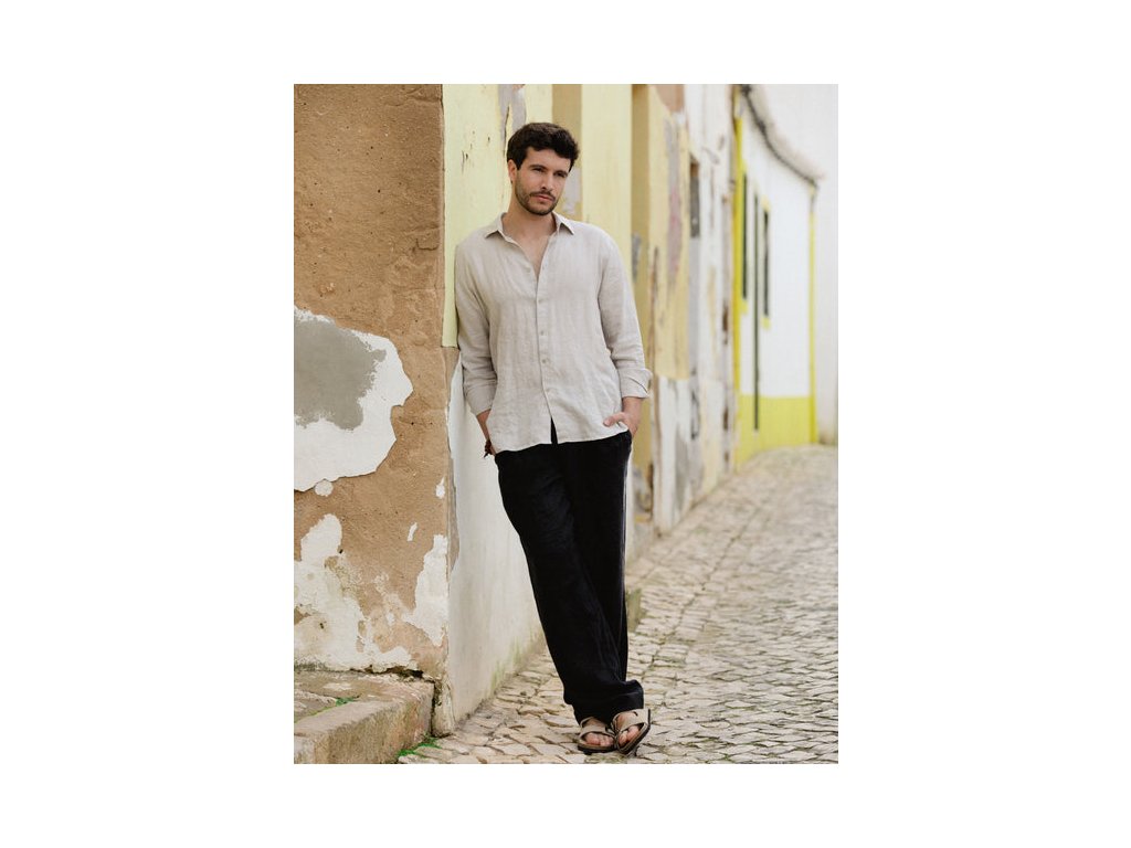 Pánská lněná košile CHICAGO z přírodního lnu je vyrobena ze 100% evropského lněného lnu v prodyšné středně gramážní tkanině. Přiléhavá silueta čistě tvaruje hrudník a pas a vytváří definovaný profil. Střih k bokům je navržen tak, aby i po zastrčení zůstal pevně zastrčený, a dlouhé rukávy jsou proporcionálně přizpůsobeny tak, aby ve standardních velikostech dosahovaly až k zápěstí.
